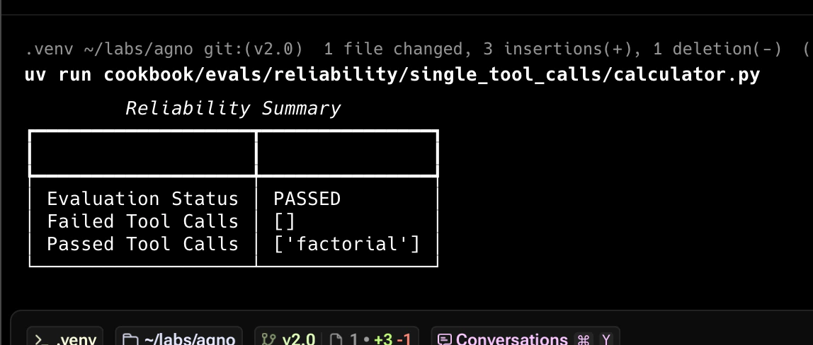 The first check is to ensure the Agent makes the expected tool calls. Here’s an example:reliability.py